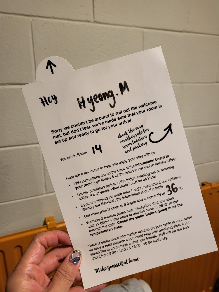 테이블에 이런 귀여운 편지도 있고 풀장 사용시간이나 참고할만한 내용들이 써있는 노트도 있음